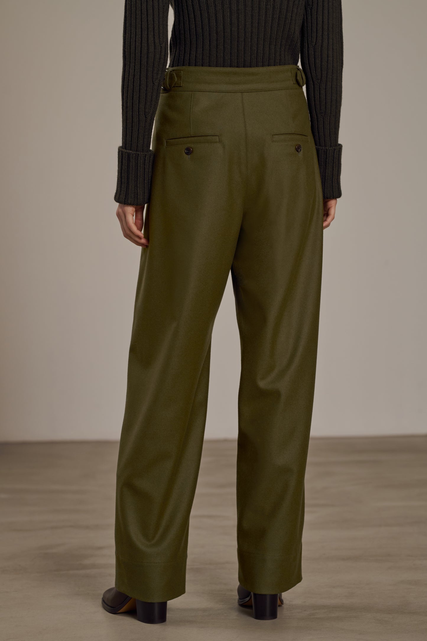 WALLY are high-waisted trousers. The tightening tabs allow you to adjust the waist. A large turn-up lets you wear them rolled up for a sleek silhouette or unrolled for an oversized, relaxed look. Made from soft and supple wool flannel, they are perfect for the depths of winter.