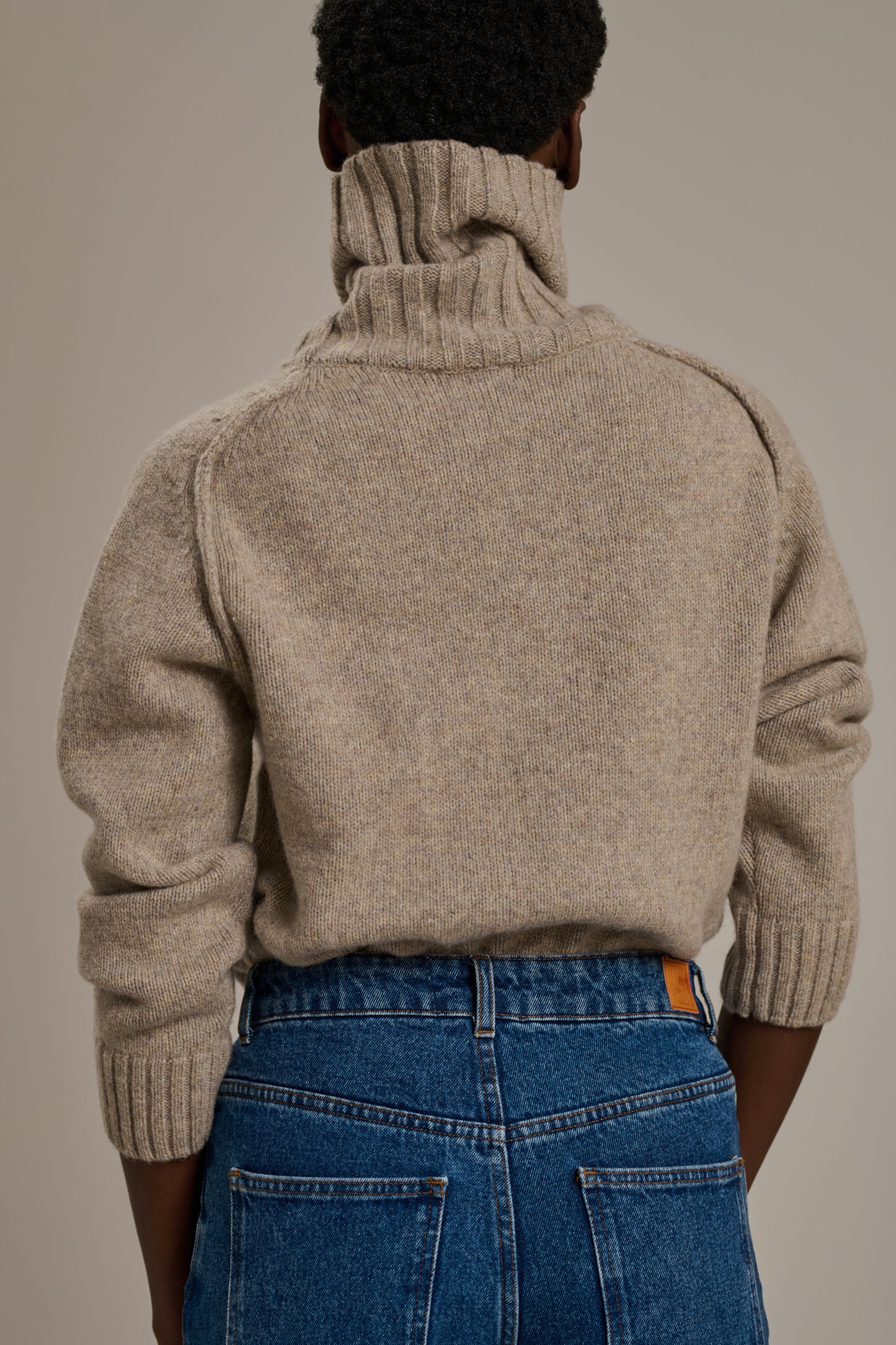 WINDY is a turtleneck wool blend jumper. Reverse seams highlight the hammer armhole. Its ribbed high neck has been intentionally extended to give it a unique look. You can roll or fold the collar according to your preference. Its short and fitted shape allows it to be easily tucked into trousers.